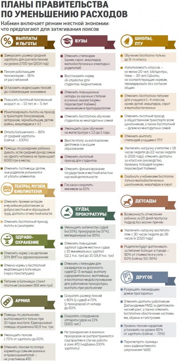 В планах Кабмина заморозить размер средней зарплаты, отменить стипендии студентам, остановить индексацию пенсий, предоставить бесплатное обучение только до 9 класса, выдавать школьные учебники только после оплаты, отменить нормы о бесплатной медпомощи и сделать платным питание в больницах.