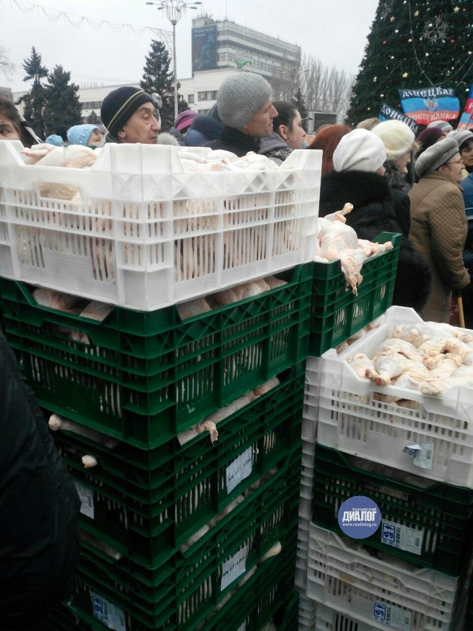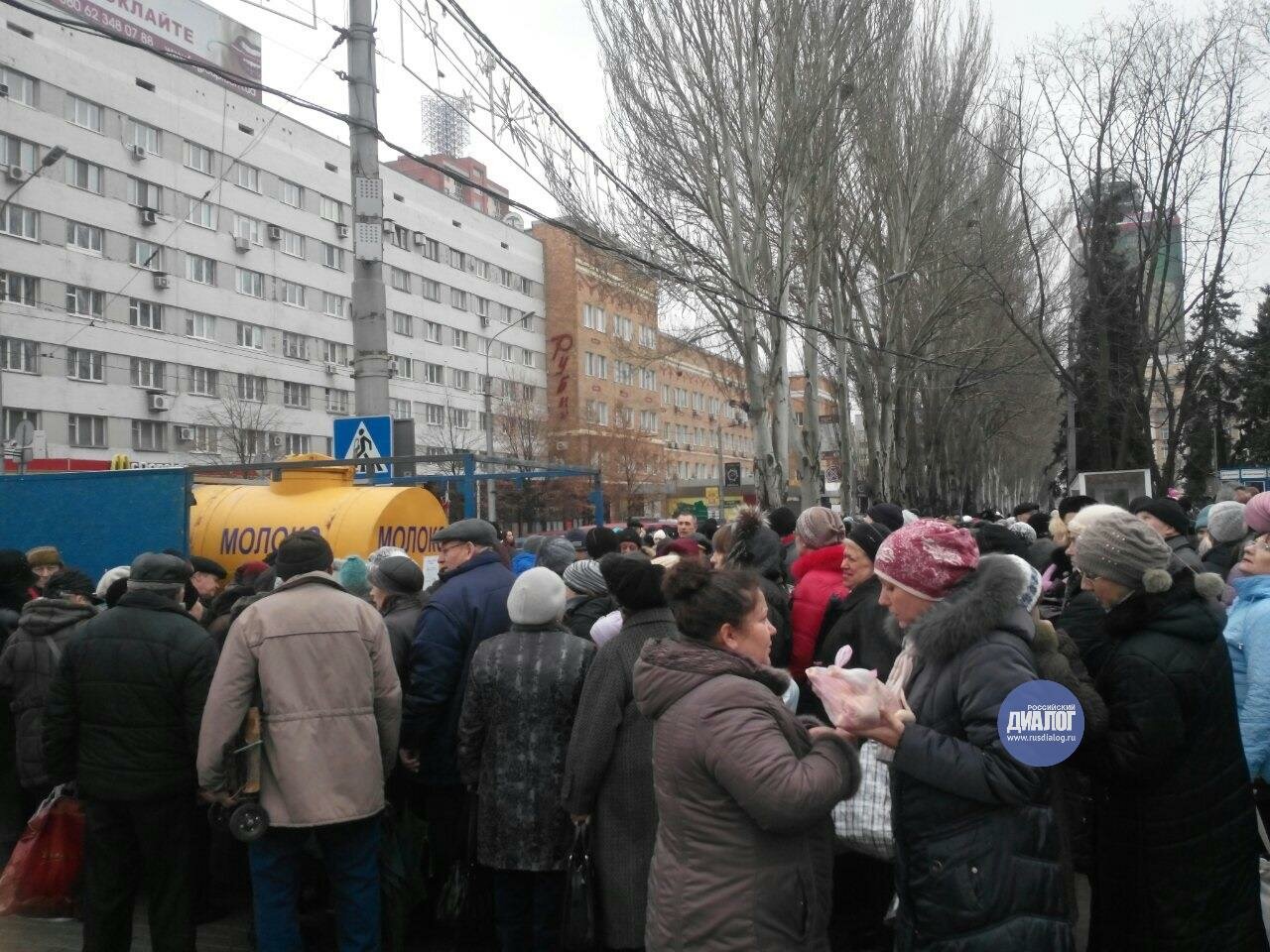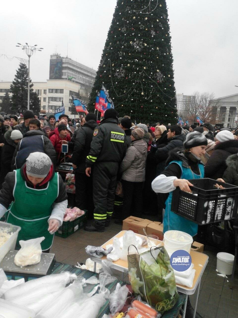 Рядом также проходит ярмарка, на ней выстроились несколько очередей за продуктам по социальным ценам. Так, жителям Донецка предлагаются различные овощи по цене 1,60 грн. за килограмм, литр молока по 4 грн., литр подсолнечного масла по 7,50 грн. Творог, колбаса и сметана на ярмарке продаются по 15 грн, хлеб - по 2,30 грн.