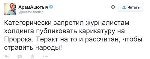 «Категорически запретил журналистам холдинга публиковать карикатуру на Пророка. Теракт на то и рассчитан, чтобы стравить народы!» - в свою очередь написал гендиректор Lifenews Арам Габрелянов.