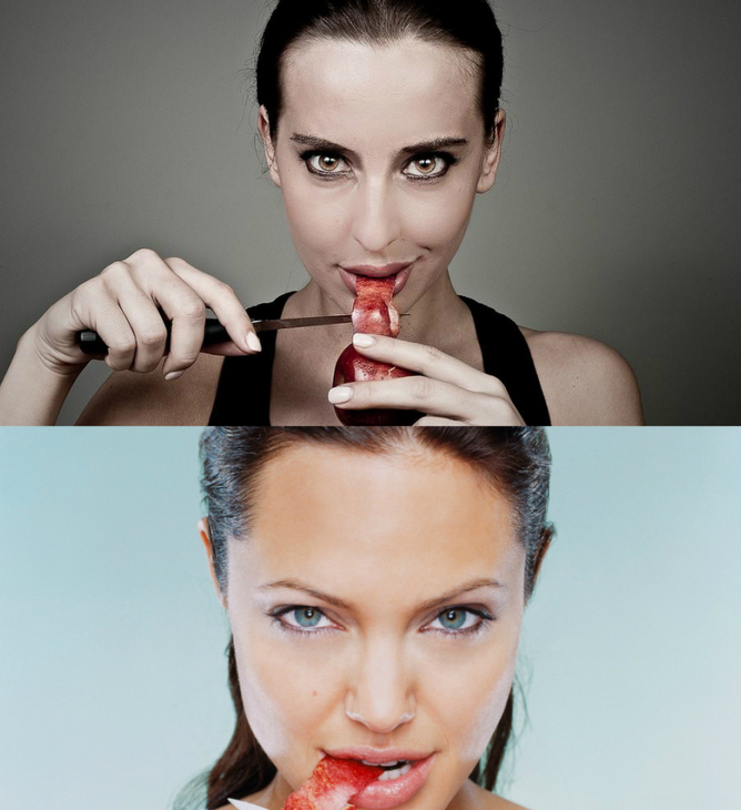 Ниже, для сравнения, мы приводим вам фотоснимки новоназначенного советника министра экономики Яники Мерило и фотосессии Анджелины Джоли.