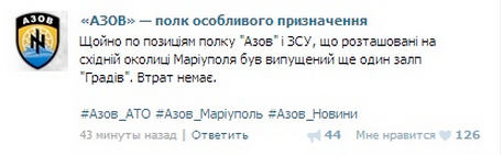 "Только что по позициям полка "Азов" и ВСУ, расположенных на восточной окраине Мариуполя был выпущен еще один залп "Градов". Потерь нет", - сообщает батальон "Азов".