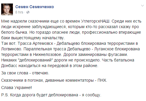 P.S. Когда дорога будет деблокирована - я сообщу", - написал Семенченко.