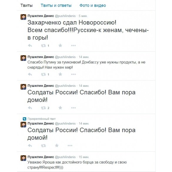 Сегодня, 13 февраля, в твитере Дениса Пушилина появилось обращение к Дмитрию Ярошу. «Уважаю Яроша как достойного борца за свободу и свою страну. Respect!», - сообщалось в Twitter. Кроме того, Пушилин поблагодарил российских солдат, добавив, что им пора домой. Также в микроблоге боевика появилась запись относительно О.Захарченко. «Захарченко сдал Новороссию. Всем спасибо. Русские – к женам, чеченцы – в горы», - написал он.