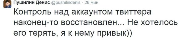 Позже Денис Пушилин удалил все сообщения из микроблога и написал, что аккаунт взломали: «Контроль над аккаунтом твиттера наконец-то восстановлен... Не хотелось его терять, я к нему привык».