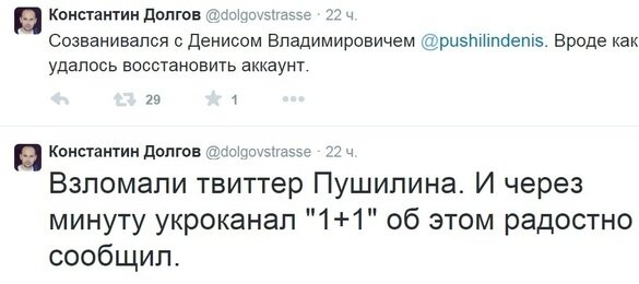 Также ситуацию прокомментировал сопредседатель Народного фронта Новороссии Константин Долгов: «Взломали твиттер Пушилина. И через минуту укроканал "1+1" об этом радостно сообщил. На воре и шапка горит. Заказчик взлома очевиден… Созванивался с Денисом Владимировичем. Вроде как удалось восстановить аккаунт».