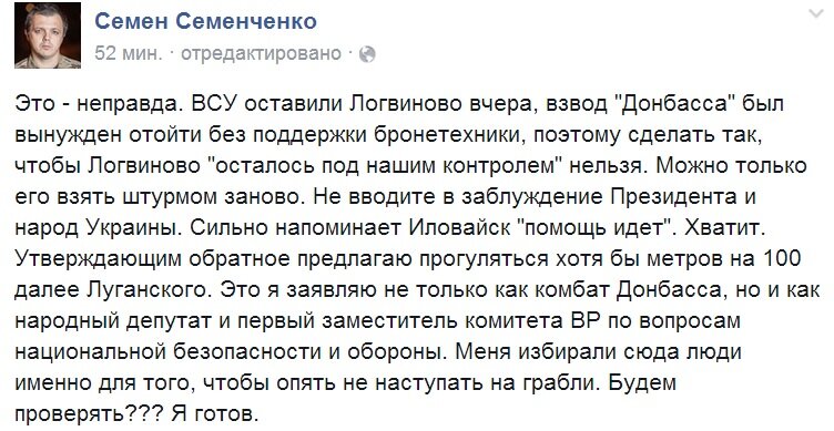 «Это - неправда. ВСУ оставили Логвиново вчера, взвод «Донбасса» был вынужден отойти без поддержки бронетехники, поэтому сделать так, чтобы Логвиново «осталось под нашим контролем» нельзя. Можно только его взять штурмом заново. Не вводите в заблуждение Президента и народ Украины. Сильно напоминает Иловайск «помощь идет». Хватит. Утверждающим обратное предлагаю прогуляться хотя бы метров на 100 далее Луганского. Это я заявляю не только как комбат Донбасса, но и как народный депутат и первый заместитель комитета ВР по вопросам национальной безопасности и обороны. Меня избирали сюда люди именно для того, чтобы опять не наступать на грабли. Будем проверять? Я готов.