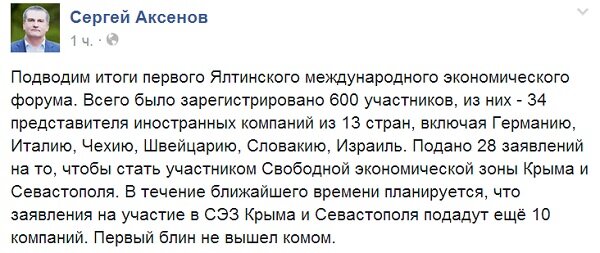 «Всего было зарегистрировано 600 участников, из них - 34 представителя иностранных компаний из 13 стран, включая Германию, Италию, Чехию, Швейцарию, Словакию, Израиль. Подано 28 заявлений на то, чтобы стать участником Свободной экономической зоны Крыма и Севастополя. В течение ближайшего времени планируется, что заявления на участие в СЭЗ Крыма и Севастополя подадут еще 10 компаний», сообщил Аксенов в Фейсбуке.