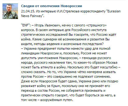 Даже если Новороссия будет сдана, Украина рано или поздно развяжет войну за Крым, поскольку она не признаёт его переход в состав России, не собирается признавать и практически открыто говорит, что будет бороться за него, в том числе – вооружённым путем", - приводятся слова Стрелкова в группе "Сводки от ополчения Новороссии" в соцсети "ВКонтакте".