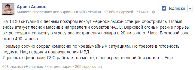 Кроме того Аваков подчеркнул, что на 18:30 ситуация с лесным пожаром вокруг ЧАЭС обострилась, поскольку огонь направляется в сторону объектов Чернобыльской атомной электростанции.