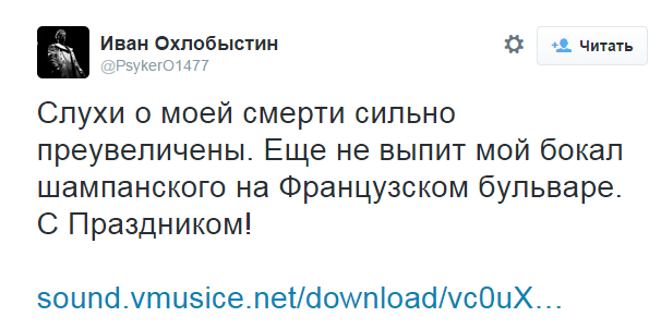 "Слухи о моей смерти сильно преувеличены. Еще не выпит мой бокал шампанского на Французском бульваре", - написал Охлобыстин.