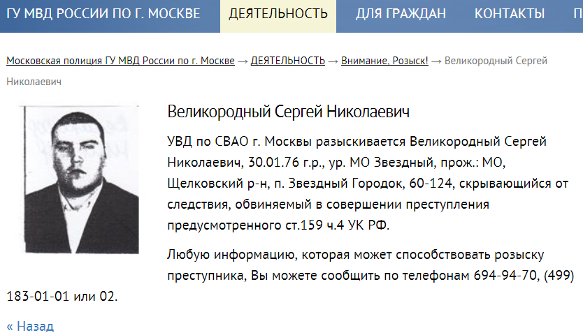 В разделе «Внимание! Розыск! » на сайте столичного полицейского главка была размещена информация о том, что Сергей Великородный 30.01.1976 года рождения, уроженец МО Звездный, проживающий в поселке Звездный Городок Щелковского района, разыскивается по обвинению мошенничестве, совершенном организованной группой лиц (ст.159 ч.4 УК РФ).
