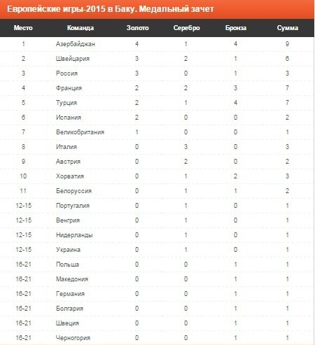 Европейские игры-2015 в Баку. Таблица медалей