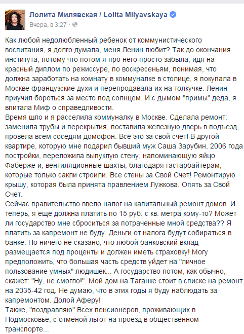 В частности, Лолита пожаловалась на то, что правительство РФ ввело налог на ремонт домов. При этом певица отметила, что ей пришлось платить по 15 рублей за квадратный метр. Она подчеркнула, что не намерена платить за капитальный ремонт в казну государства со своего кармана.
