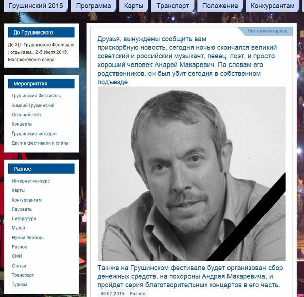 Ранее сегодня на сайте Грушинского фестиваля появилась информация о том, что Андрей Макаревич убит. Самарский областной клуб авторской песни имени Грушина пока не доступен для комментариев.