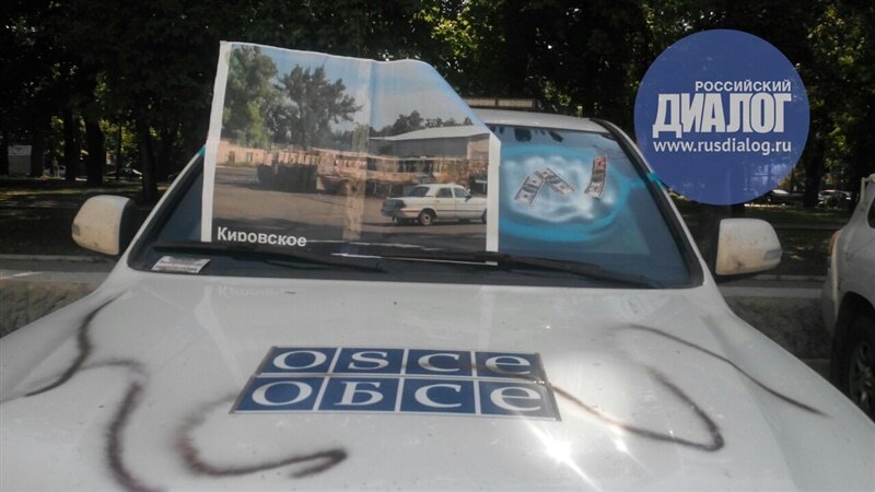 Как сообщает с места событий собственный корреспондент «Российского Диалога», в ходе акции несколько человек начали разрисовывать краской машины иностранных наблюдателей. В это время из отеля вышел вооруженный пистолетом человек в гражданской одежде и потребовал прекратить портить авто.