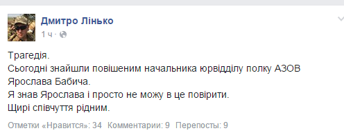 "Сегодня нашли повешенным начальника юротдела полка «Азов» Ярослава Бабича. Я знал Ярослава и просто не могу в это поверить", — написал Линько.