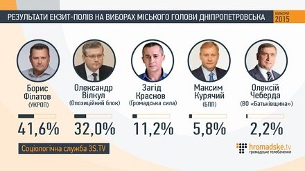 Согласно предварительным результатам, за Бориса Филатова было отдано 41,6% голосов. Следом идет кандидат от "Оппозиционного блока" Александр Вилкул, за которого проголосовали 32% избирателей.