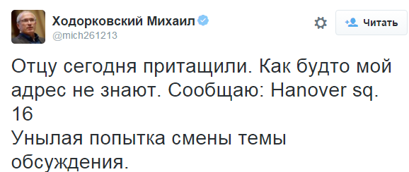 О том, что Михаил Ходорковский вызван на допрос, он сообщил сам в микроблоге Twitter. По его словам, повестка была вручена его отцу в связи с тем, что сам он находится за пределами РФ.