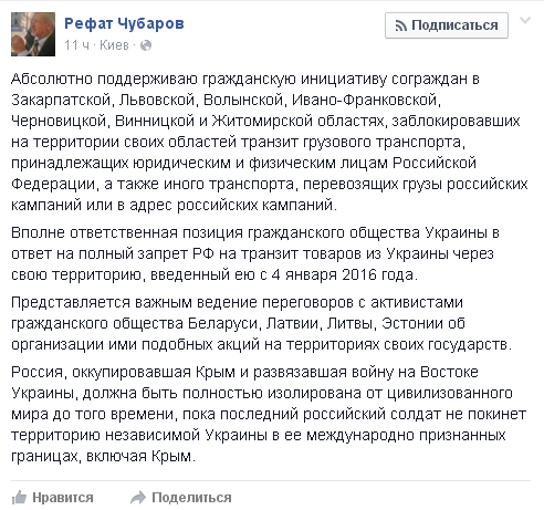 Глава Меджлиса назвал действия радикалов "ответственной позицией гражданского общества Украины в ответ на полный запрет Российской Федерацией на транзит товаров из Украины через свою территорию".