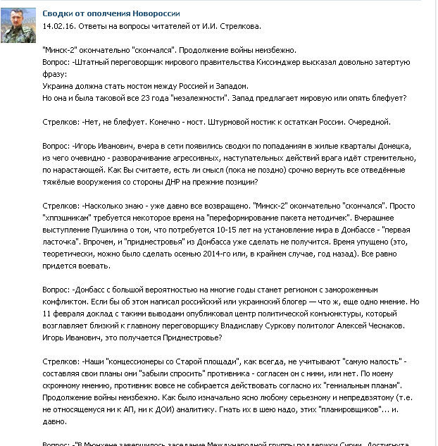 "Минск-2" окончательно "скончался". Просто "хппэшникам" требуется некоторое время на "переформирование пакета методичек", - заявил Стрелков.