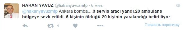 Прибывший на место взрыва в Анкаре губернатор города подтвердил гибель минимум пяти человек в результате взрыва вечером в среду. Еще 10 человек получили ранения.