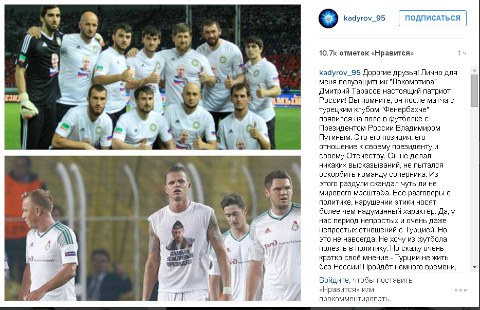 "Лично для меня полузащитник "Локомотива" Дмитрий Тарасов — настоящий патриот России", - написал Кадыров в своем инстаграме.