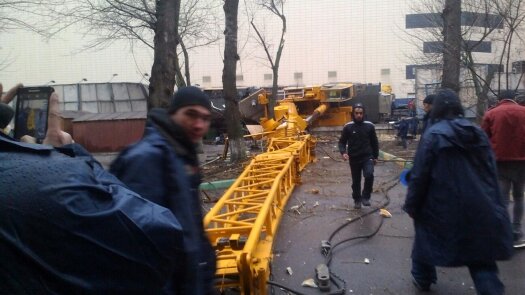 В результате падения крана погиб его машинист. Кроме того, несколько человек получили травмы, степень серьезности которых неизвестна.