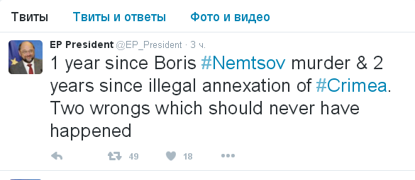 "1 год с момента убийства Бориса Немцова, 2 года с момента "незаконной аннексии" Крыма. Два правонарушения, которых не должно было случиться", - написал Шульц.