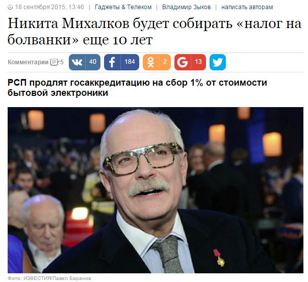 Выяснилось, что лауреата "Оскара" возмутила публикация с заголовком "Никита Михалков будет собирать "налог на болванки" еще 10 лет". По его словам, опубликованные в ней данные не соответствуют действительности. За ложную информацию он требует от ответчиков 750 тыс. рублей.