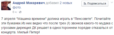 При этом Макаревич уточняет, что решение дирекция приняла в одностороннем порядке, руководствуясь при этом якобы поступившими тремя звонками "какого-то мудака". Уточняется, что всего неизвестный звонил три раза.