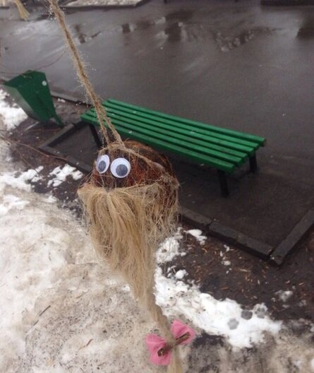 О страшной находке местным СМИ сообщил житель города. При ближайшем рассмотрении оказалось, что кормушка сделана из кокоса, а к нему приклеены волосы и глаза. Издалека странный предмет очень сильно смахивает на голову маленькой девочки, которая висит на ветке.