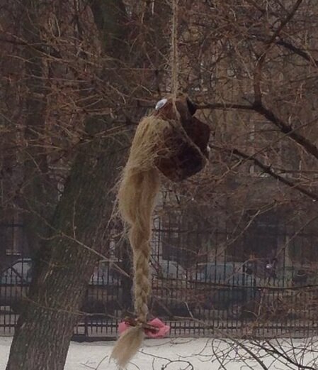 Пока что неизвестно, кто является создателем кощунственной кормушки, и как долго она висела на дереве.