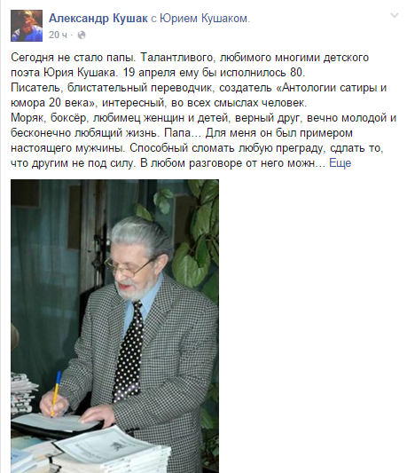 "Сегодня, 7 марта, не стало отца. Одаренного, любимого многими людьми поэта, писавшего для детей, Юрия Кушака. 19 апреля ему бы было 80 лет. Писатель, великолепнейший переводчик. Моряк, боксер, любимец прекрасного пола и малышей, верный товарищ, вечно молодой и бесконечно обожающий жизнь", - отметил Александр.