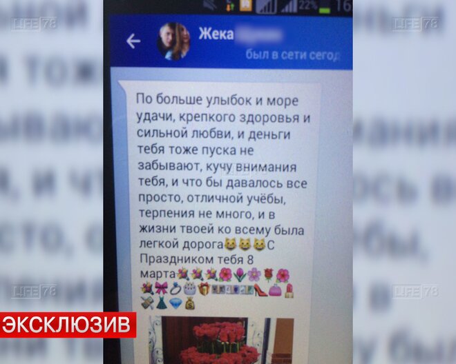Юлия также добавила, что Евгений прислал ей смс с поздравлением к 8 марта, написав много приятных слов. "Я ответила: спасибо, но 8 марта-то завтра. Потом я узнала, что произошло то, что произошло", - сказала она.