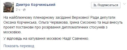 По словам Корчинского, разрыв дипломатических отношений должен стать ответной реакцией Украины на удерживание за решеткой летчицы Надежды Савченко. Законопроект будет выставлен на голосование на очередном пленарном заседании.