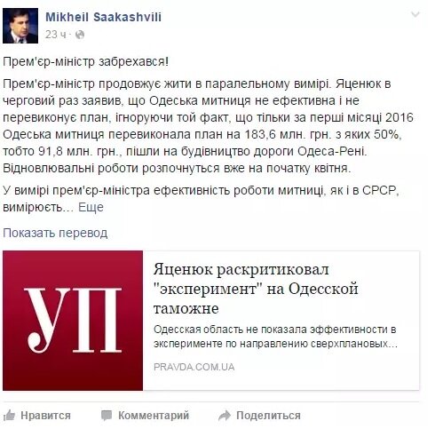 Как пишет "Диалон.UA", на своей странице в Facebook Саакашвили ответил на выпады Яценюка в своей адрес во вопросу неэффективности функционирования Одесской таможни и отсутствия на деле якобы проведенных им реформ.