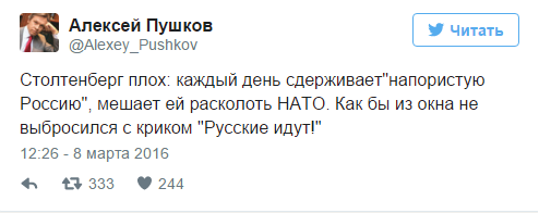 "Столтенберг совсем плох: ежедневно сдерживает "напористую Россию", пытается ей помешать совершить раскол НАТО. Как бы не выпрыгнул из окна с криком "Русские идут!", - отметил он.