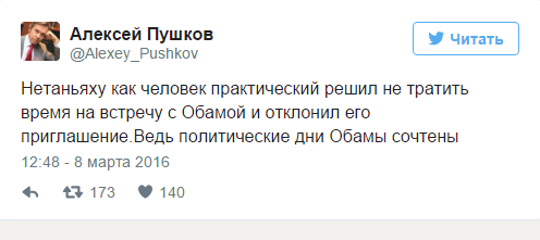 "Нетаньяху как человек практичный принял решение не растрачивать свое время на беседу с Обамой и отказался от его приглашения. Потому что дни Обамы как политика сочтены", - сообщил Пушков в персональном профиле в Twitter.