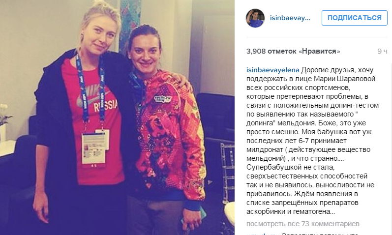 Всемирно известная прыгунья с шестом Елена Исинбаева, которая ранее также оказалась в центре конфликта, выступила с поддержкой спортсменов, которые провалили допинг-тест из-за приема запрещенного препарата мельдония (милдроната).