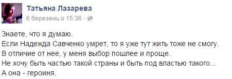 В своем официальном аккаунте на "Фейсбуке" Татьяна высказала отношение к властям и добавила, что не захочет жить в РФ в случае, если Савченко погибнет из-за объявленной ею голодовки.