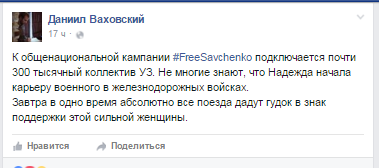 "К общенациональной кампании #FreeSavchenko подключается почти 300-тысячный коллектив УЗ. Не многие знают, что Надежда начала карьеру военного в железнодорожных войсках. Завтра в одно время абсолютно все поезда дадут гудок в знак поддержки этой сильной женщины", — отметил Ваховский.