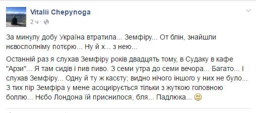 Нардеп из президентской фракции "Блок Петра Порошенко" Виталий Чепинога в социальной сети написал, что Украина потеряла Земфиру. Однако, как известно, незаменимых нет.