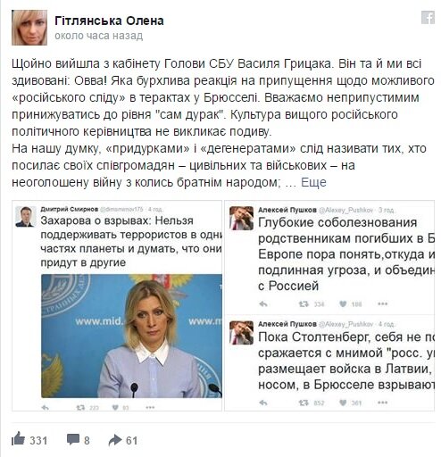При этом Гитлянская утверждает, что "придурки" и "дегенераты" находятся не в украинских силовых структурах, а якобы среди представителей российских властей.