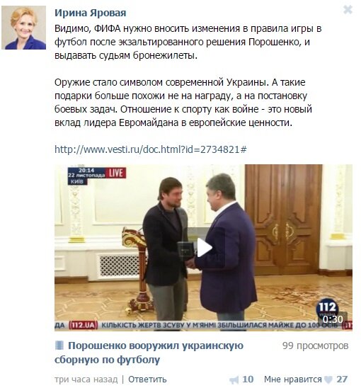 На своей странице в "Вконтакте" она написала: "Видимо, ФИФА нужно вносить изменения в правила игры в футбол после экзальтированного решения Порошенко и выдавать судьям бронежилеты".