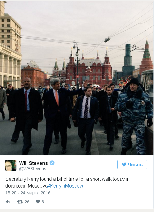 Отметим, несмотря на плотный график, Джон Керри нашел время для прогулки по российской столице.