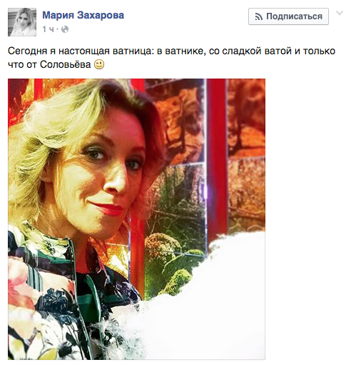 Официальный представитель опубликована на своей странице в Фейсбуке фото "в ватнике, со сладкой ватой". В записи уточнялось, что снимок был сделан после съемок в программе журналиста Владимира Соловьева.