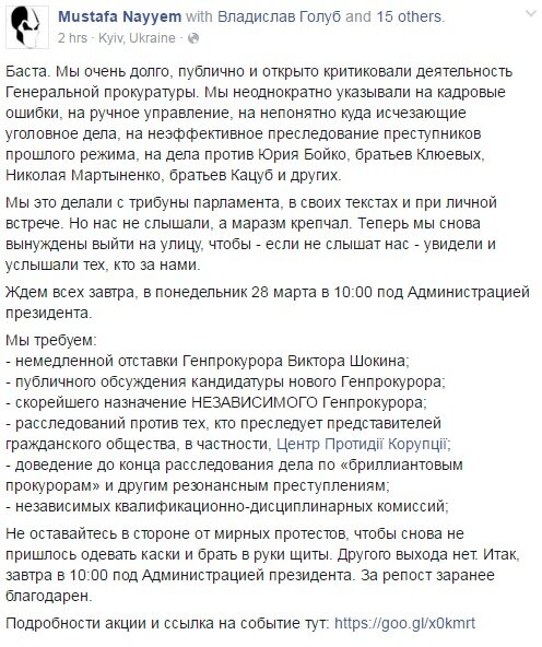 Украинский депутат выразил недовольство действиями Генпрокуратуры Украины. Кроме того, он выделил ряд требований, в которые входят отставка Виктора Шокина и публичное назначение нового генпрокурора.