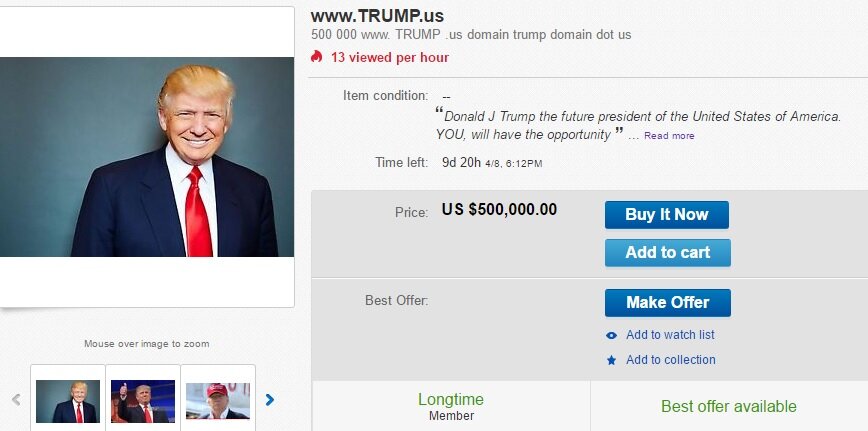В комментарии к лоту сказано, что "Трамп станет следующим президентом США", а у счастливца, выложившего сумму в $500 тысяч, появиться возможность владеть доменом сайта самого влиятельного человека мира в ближайшем будущем.