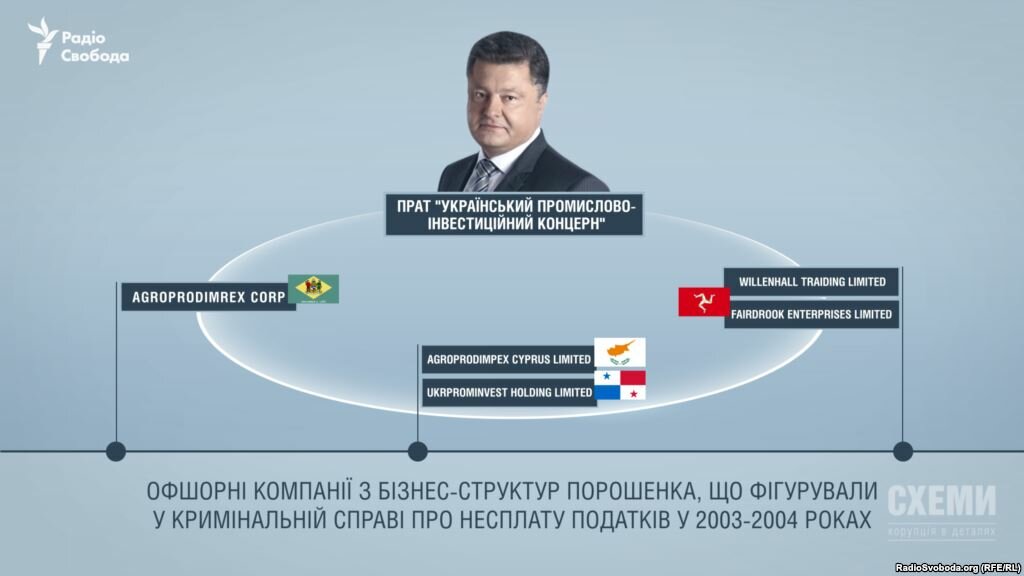 Также отмечается, что тогда следствие обратилось к коллегам из других стран и Интерполу с просьбой помочь в расследовании. Речь шла о пяти офшорных компаниях: Ukrprominvest Holding Ltd (Панама), Agroprodimpex Corp. (Штат Делавэр, США), Willenhall Trading Ltd и Fairbrook Enterprises Ltd (о. Мэн), Agroprodimpex Cyprus Ltd (Кипр).