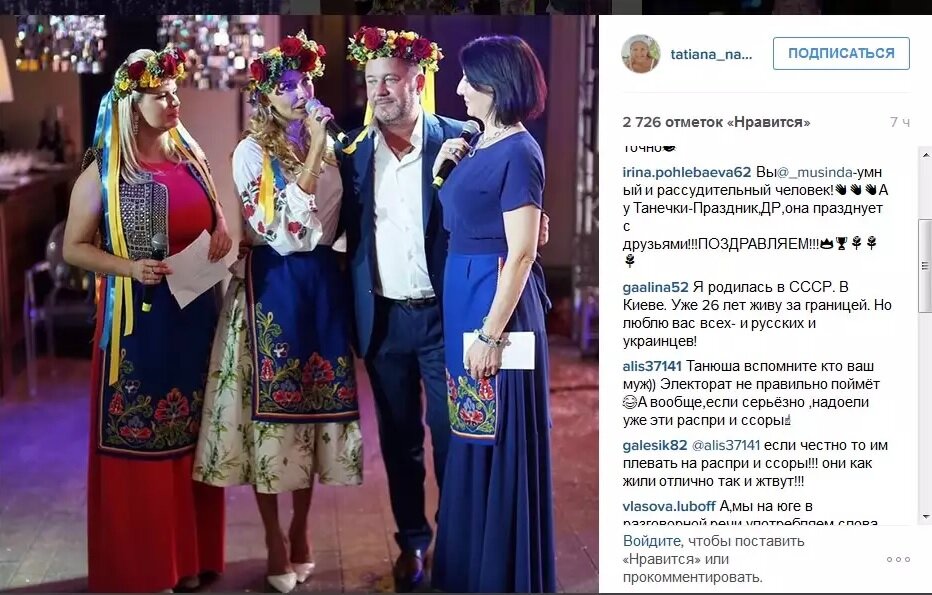 Навка предстала в традиционном украинском наряде - вышиванке, фартуке и венке с ленточками в цвета украинского флага. Судя по фото, экс-фигуристка была ведущей на одном из мероприятий, посвященных чьему-то дню рождения.